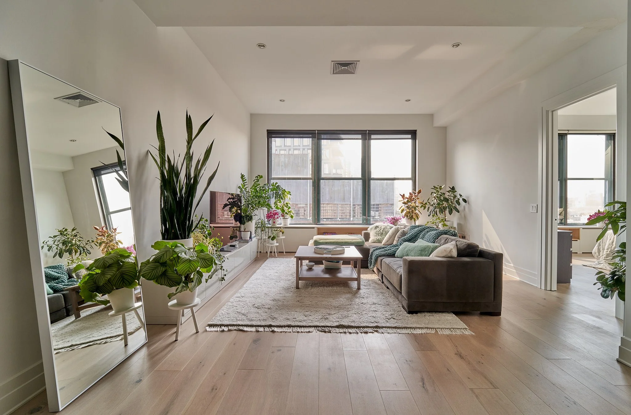 Whitewashed oak and lacquer radiator enclosures provide storage beneath the oversized windows. The cesarstone top is an easy to maintain surface for thriving house plants.